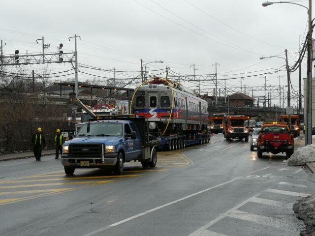 | Silverliner V single unit 701 (incidentally numbered the same as the mockup) wound its way through part of Philadelphia on its way to SEPTA's Liberty Yard this morning. The first mention of the move came before dawn via the traffic reports as a "wide load" or "SEPTA's new trolley" was tying up traffic on Roosevelt Boulevard before exiting onto Hunting Park Avenue. |