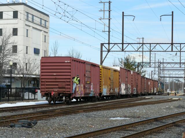 | With the Lansdale Warehouse siding empty, B738 is now determined to fill it, shoving seven box cars (including two high cubes) through Dale Interlocking on SEPTA Main Line. |