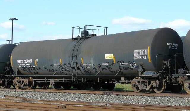 | Unfortunately, the other 99 cases are more along these lines. A couple of teenage knuckleheads were tagging the black tank cars in the yard with what was presumably the only paint they had (hope it was the only paint they had, but if it wasn't, their dubious color choice would certainly be consistent with their extremely flawed decision making skills that were on display) before a railfan appeared and, like vermin, the miscreants scurried away. |