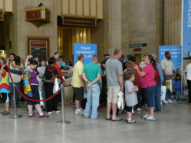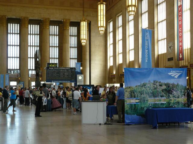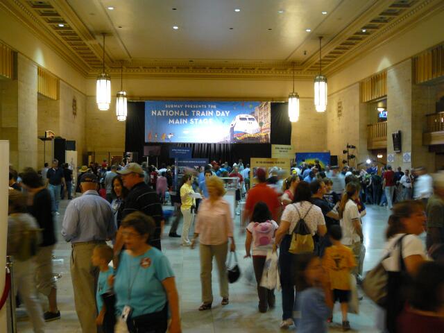 | The hall adjacent to the main station concourse featured a stage with entertainment as well as exhibits like "Baseball Junction: The History of Baseball and the American Railroad", "Amtrak: Dining the Rail Way", "Trains Move Our Economy" and the "Go-Green Express". |