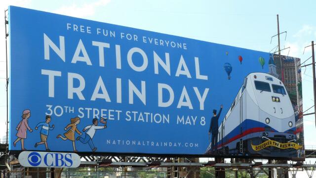 | Amtrak celebrated National Train Day at a number of stations across the country, Philadelphia's 30th Street Station being one of them, as advertised on the billboard behind the station (ironically you could have been threatened with arrest by Amtrak police for taking this picture just a few years ago) ... |