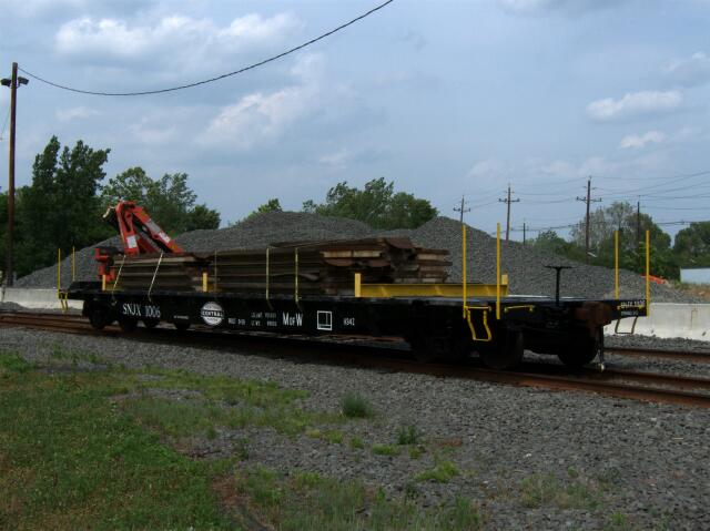 | SNJX 1006 is one confused little flat car. It wears a New York Central herald on its side but a Pennsylvania-type class of H34Z, which would make it a hopper. The load consists of concrete and steel sections used for grade crossing replacement. |