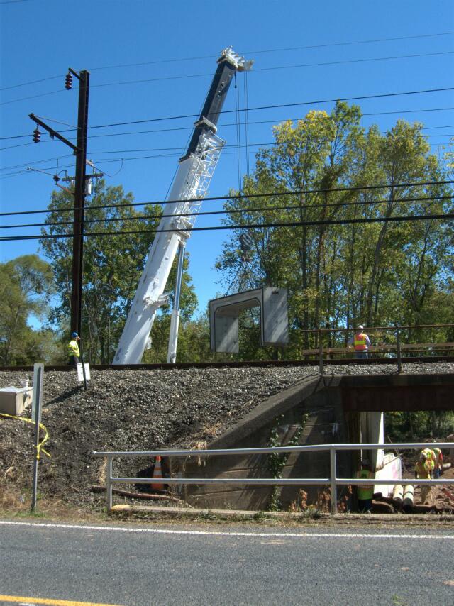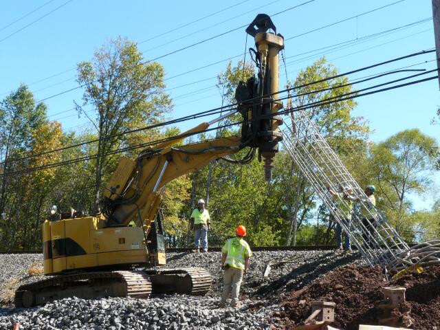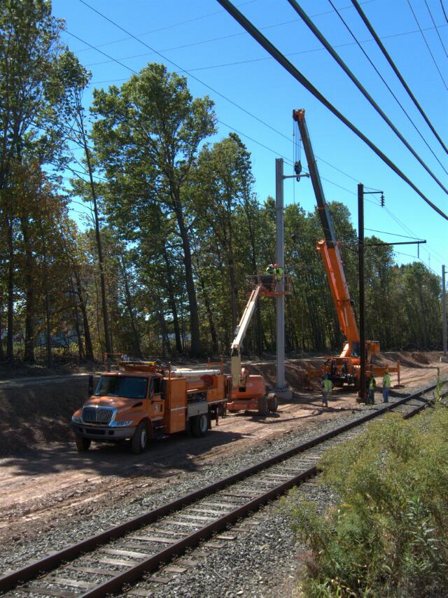 | One of the trickiest tasks on an electrified railroad is getting around all the wires, as shown here as workers lower a rebar reinforcing column into a hole that will shortly be filled with concrete for use as a base for a new catenary pole. |