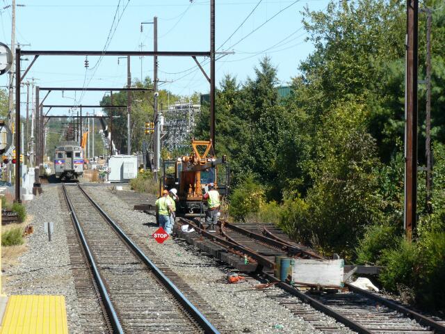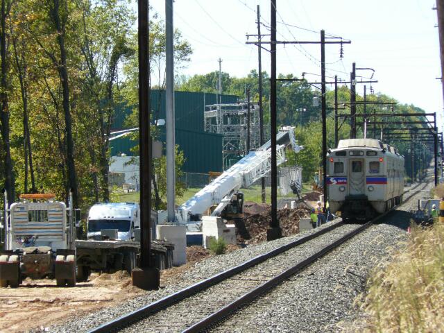 | SEPTA had some big cranes out working on the new siding at Link Belt on Monday. While most of the cranes SEPTA uses are rentals, this one, on catenary support duty, is their own. |