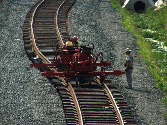 | It appears this machine is used to straighten out the track by locking onto the forward section of rail, using the tines in the center to dig into the ballast and anchor the base, and the rear section locking onto the rail to pull the out-of-alignment track over. |