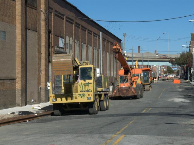 | On weekdays, a small army of SEPTA employees and equipment has been toiling down on Frankford Avenue for more than a month, putting in the first "new" trolley rail in years. Here it is Sunday morning and while the Sugar House Casino, which is behind the camera and the destination for the new track, is open for business, for the construction it is a day of rest. |