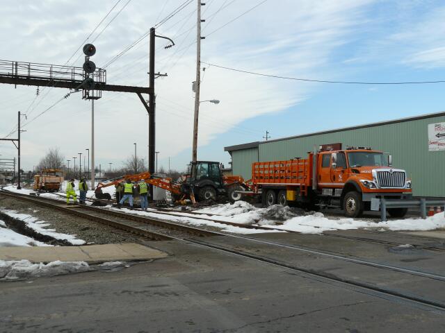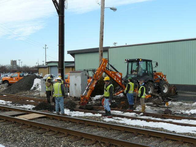 | Meanwhile C&S crews are working up and down the branch installing the new signalling. Here they are digging under the front track of the wye at Fifth Street grade crossing in Lansdale in order to connect to a new signal box across the tracks. |