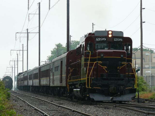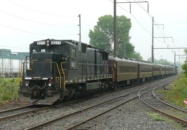 | GP30 2198 had departed New Hope with the seven cars and picked up former Conrail and Norfolk Southern C39-8 8211 in Ivyland. The recently refurbished engine still had its cab signal equipment, so it was ok for the trip north. |