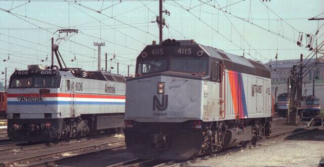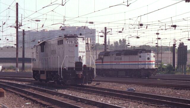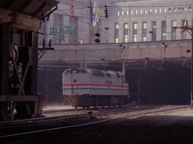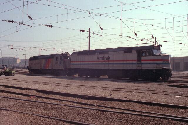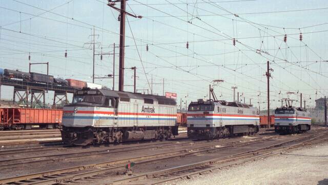 I am sure that of those of us railfans that take pictures, inevitably the question comes up "Why?" A couple of the better answers may be "You might not be able to take pictures in a certain location again" and "You might not realize what you are seeing until the prints come back" . These pictures, taken in September 1991, cover both those. The vantage point is ground level at Race Street Yard, 30th Street Station in Philadelphia. A Conrail train is on the High Line heading toward South Philly, and a nice variety of passenger power is on display. The surprise was the appearance of Amtrak F40PH 202, the AC unit. I didn't notice until I looked at the prints a week later. You can distinguish it from standard units like NJT 4115 and AMT 406 by the lack of porch on the rear. The heavyweight passenger cars are used as offices, and Amtrak 16200 waits for the Amtrak steam engine of its dreams. More than a decade later, the F40's are gone, as well the heavyweights, the tender, most of the GP9's and Conrail, the E60's numbers are dwindling, and you can't even take pictures from the public parking lot above. You just never know. |