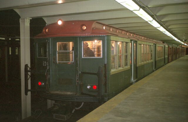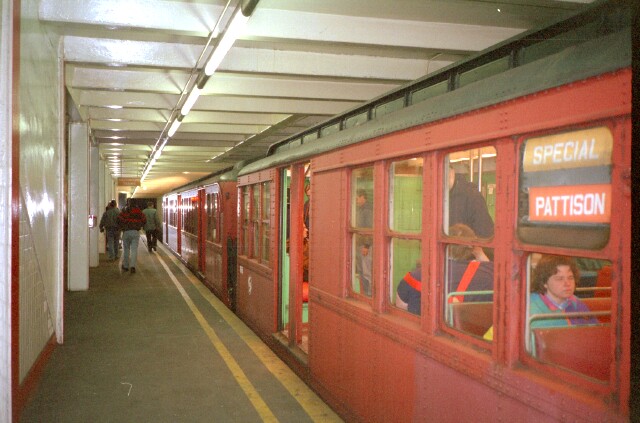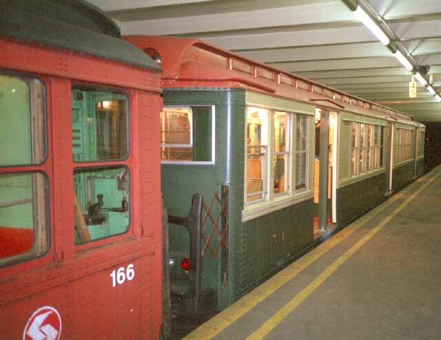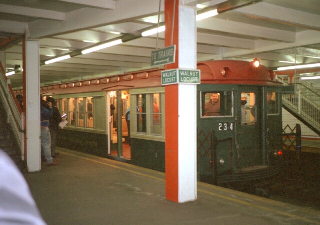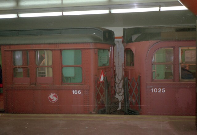 | Many railfan photographers are the fair weather sort, only shooting in perfect sunlight. Well, this NRHS sponsored ramble was not for them, as most of it was spent in the tunnels of the Broad Street Subway. The "Orange Line" cars from Kawaski had supplanted them, but these old girls still functioned, almost 70 years after their creation. If memory serves, 166 and 234 were Broad Street cars, while 1025 was a Bridge car that was used on the Benjamin Franklin Bridge before it was replaced with the Budd-built PATCO cars. |