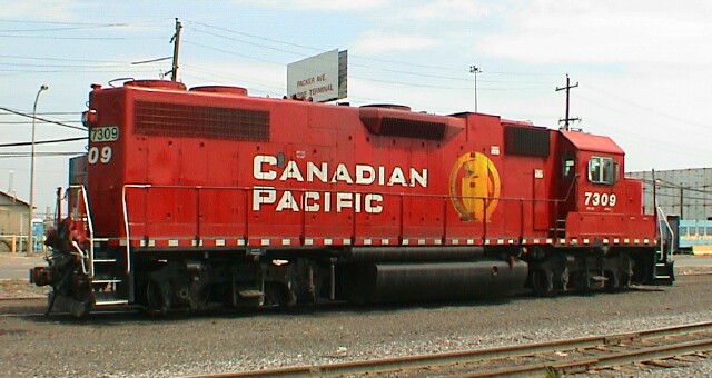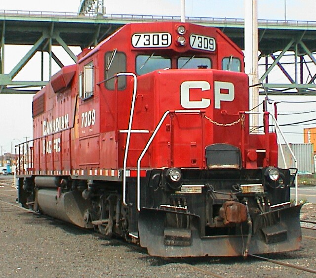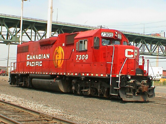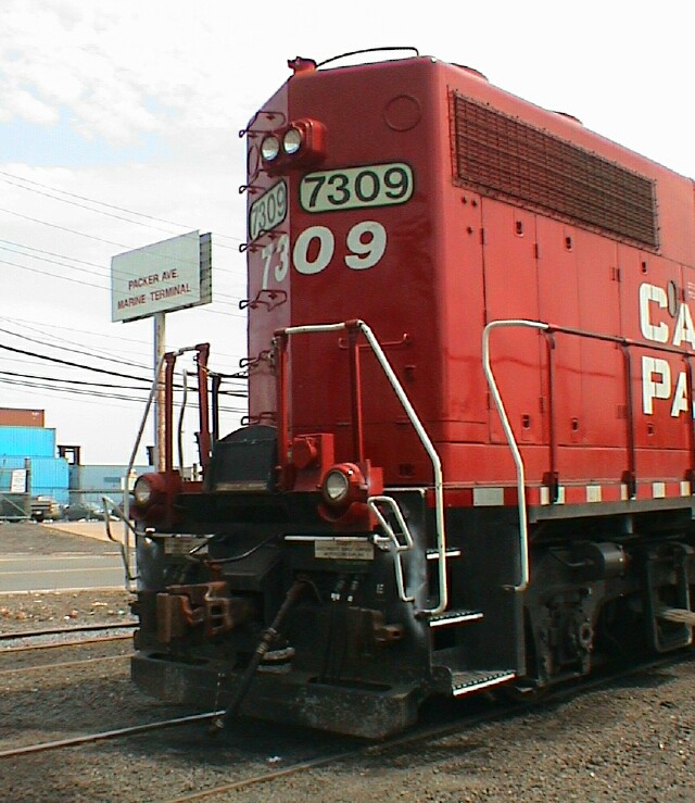As a fitting complement to the celebration this week of the American Revolution which started here on the Atlantic seaboard, here are shots of the Canadian Pacific presence in Philadelphia, namely the former Delaware and Hudson GP38-2 7309, now in Golden Beaver scheme, which was holding down the local power assignment in South Philly. The last shot is facing north from the Packer Avenue Marine Terminal, with a view of the cars on the CP storage tracks along Delaware Avenue, drawfed by the twin smoke stacks of the soon-to-be-restored SS United States. |