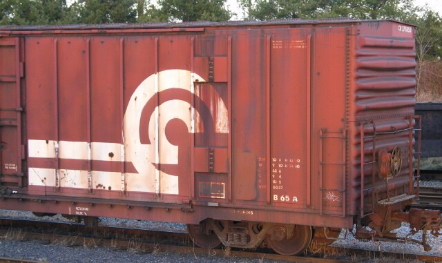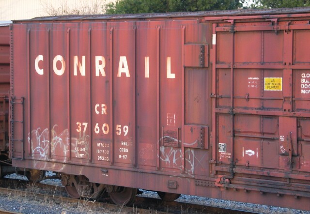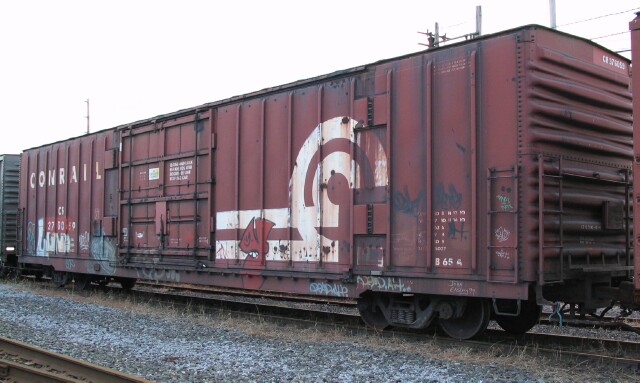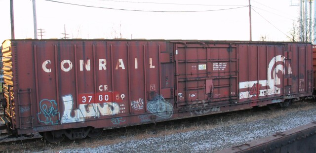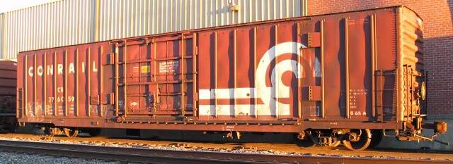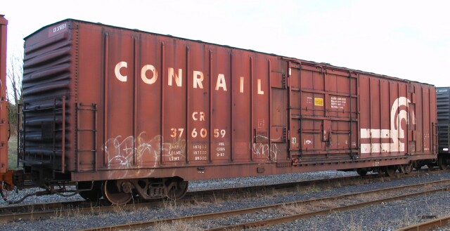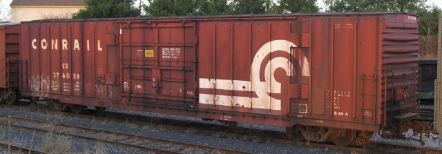 One of the first boxcars ordered by Conrail after its inception was the B65A series, often referred to as "beer cars". Built in the spring of 1977 by Fruit Grower's Express in Alexandria, Virginia, the 190 cars were numbered 376001 to 376190 and were the only insulated boxcars built for Conrail. They were classified by the AAR mechanical designation of RBL (bunkerless refrigerator car with a minimum of 3" of insulation on the sides and ends and 3.5" on the floor, and equipped with an adjustable loading or towing device), with an AAR car type code of R610. The interior dimensions were 62' 6" long, 9' 4" wide and 10' 5" high. The exterior dimensions were 69' 6" long, 10' 8" wide and 15' 3" high, and were painted with the "large can opener" logo, which they still wear today. They came with cushion underframes and single 14' by 10' plug doors, and the interiors were fitted with dual pnuematic bulkheads. The volume was 6076 cubic feet and weight capacity was 154,000 pounds. These Plate C cars originally were in assigned service. Conrail cars have become a rarity in Lansdale PA, so car number 376059, which arrived on CSX train C746 on December 24 2003, has received the full treatment here. |