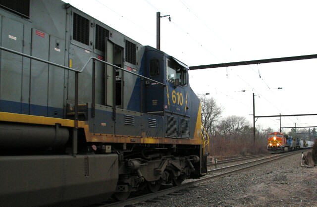 Tropicana Train K650 led by CSX 610 passes Q417 with BNSF leader at Stony Hill Road |