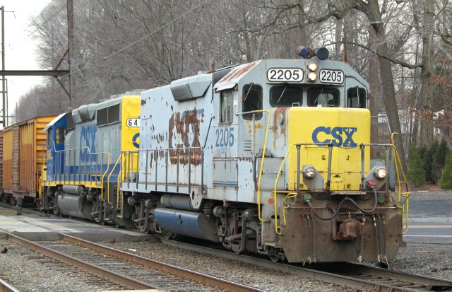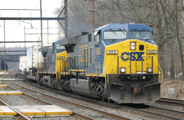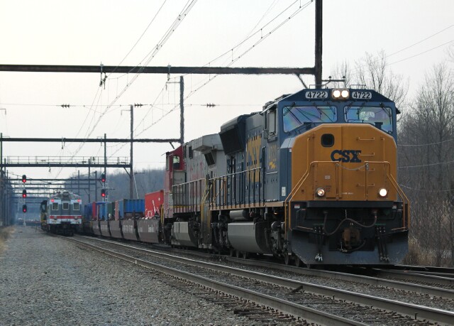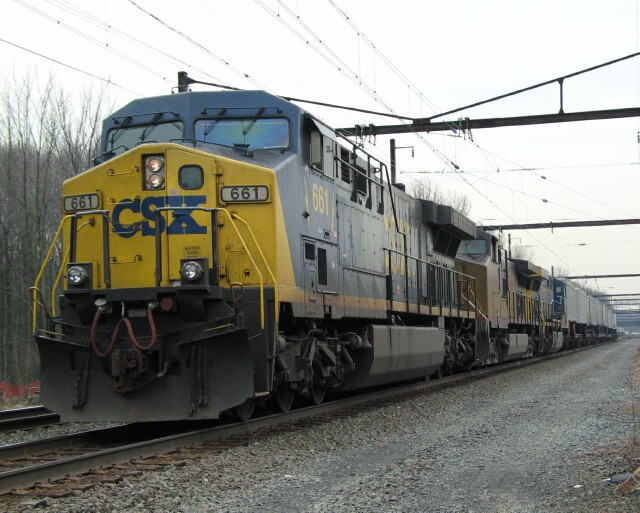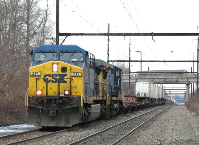 | Q176 with CSX units sandwiching a UP engine at CP Wood | ||||||||||