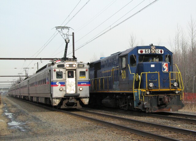 | SEPTA local passes wire train at CP Wood | ||||||||||