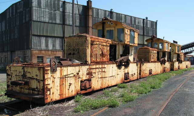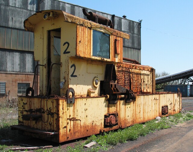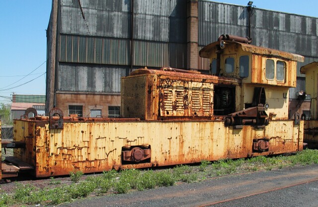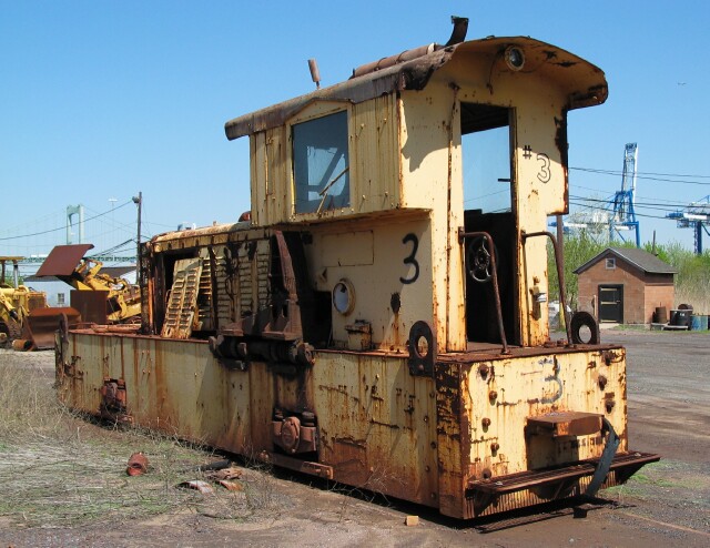 | Once the largest dedicated bulk handling facility on the Philadelphia waterfront, Pier 122 was built by the Pennsylvania Railroad to handle iron pellets from South America. Its four bulk unloading cranes fed two conveyor belts to a transfer house, and the tracks could handle up to 400 of the G38 and G39 ore jennies. Later owned by Penn Central, Conrail and now Norfolk Southern, the ore shipments ceased in 1998. During operation in the winter months, ore was stored in piles on the open frozen ground, which would later thaw and cause the much heavier ore to sink into the river bank, creating what has been called one of the largest man made iron ore deposits on the east coast. Remaining along with that ore and the disused pier complex itself are the four mules built by the Atlas Car and Manufacturing Company of Cleveland OH, used to shuttle the cars around the loaders. They await their fate, either preservation or scrapping, whichever comes first. |