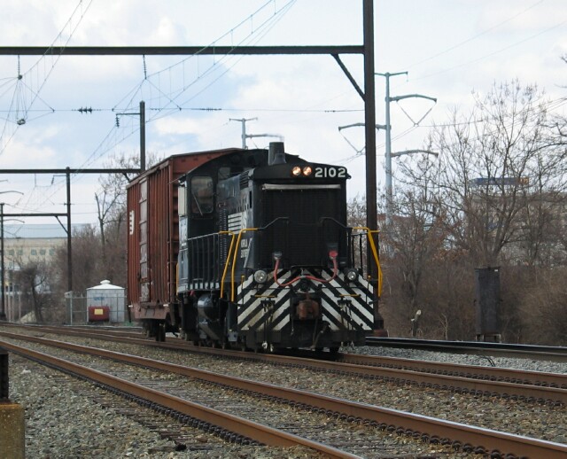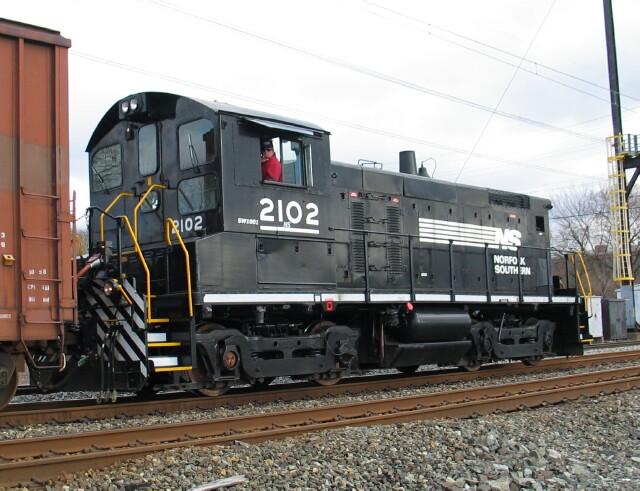 | SW1001 NS 2102, which although repainted in NS scheme does not wear the new "horsehead" logo like its sibling 2106 here, is former Reading 2612 and Conrail 9412. SW1001's have been a fixture in the industrial areas around Philadelphia for years (click here and here for pictures of them working ex-Reading lines in Conrail and CSX paint and working the NEC in Conrail, CSX and NS schemes here and here) |