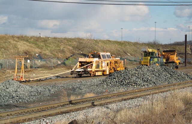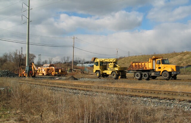 | Along with an NS high rail truck and the ballast regulator, former Conrail tamper MP 9028 appeared to be working on the area around the former Gravers Road grade crossing, accompanied by an NS dump truck and a Danella GradAll excavator. Engineering firm Danella is a familiar name around railroads due to the fiber optic cable laid by its Rail Plow. |