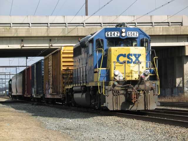 To follow up the my favorite local theme from last week, my other favorite local is operates not far from where I work. Under Conrail it was called WPMO-1 and operated out of Morrisville PA, but Morrisville is now NS and Conrail Shared Assets, so most people refer to this as the Woodbourne job. CSX 770 is the daylight portion and C764 its nighttime counterpart. C770's usual range is the CSX Trenton Line from Trenton NJ to Bustleton in Philadelphia PA, with an occasional run down to Greenwich Yard in South Philadelphia. The dispatching south of Fairless Junction is handled by CSX NI dispatcher, but when it has to venture north it is handled by SEPTA Desk 2, and shares the rails with SEPTA R3 West Trenton commuter trains as well as CSX freights. Previous pages with C770 here, here, here, and here. Power is usually GP38-2's or GP40-2's, with B23-7's, B23-7R's, SW1001's and mother-slug sets pinch-hitting at times. Lately GP40-2 6042 has been paired with B23-7R 3187, so it was quite a surprise to see that 3187 had been replaced, if only temporarily. CSX C770 passing the BCIP switch off SEPTA's Track 1, across from CP Fairless Jct. |