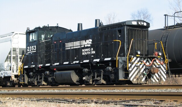 | NS MP15DC 2353 coupled up to a train in Abrams Yard. The engine is connected to an air compressor (hose to the right of front pilot) to maintain brake pressure while it sits. |