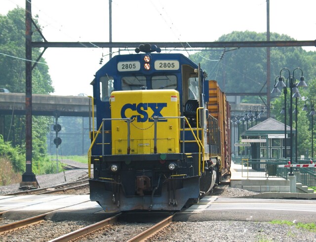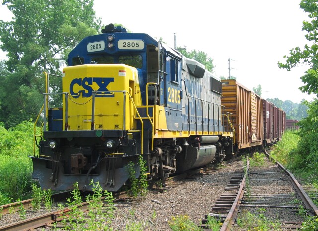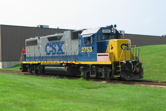 | .... and trailing was CSX GP38-2 2805. Notice the additonal yellow on the front porch of 2753 compared to the blue of 2805, as well as the difference in horns. |