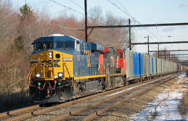 | Two days later and farther north at Dobry Road, the light is much better for Q409 with CSX ES44DC 5251 and CN C44-9WL 2604. |