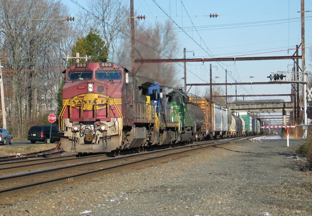 Foreign power has replaced many of the leased units on the Trenton Line recently. Q300 had BNSF 8721 and UP 4433 here on the main at CP Berry as it passes a very short K207 (two engines and three cars) stopped at the signal. BNSF 8721 is a GP60 phase IIb that was purchased by Santa Fe as 4021 back in July 1989. UP 4433 is one of the non-flared but winged SD70M's. Photography on this section of the Trenton Line at this time of year is difficult at best, especially in the early half of the day. |