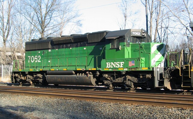 | BNSF SD40-2 7062 was the third engine on the train, and also the third different BNSF paint scheme in three days. BNSF 7062 has probably worn its BN Green paint since it was first acquired by Burlington Northern in 1978. |