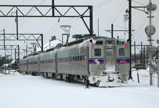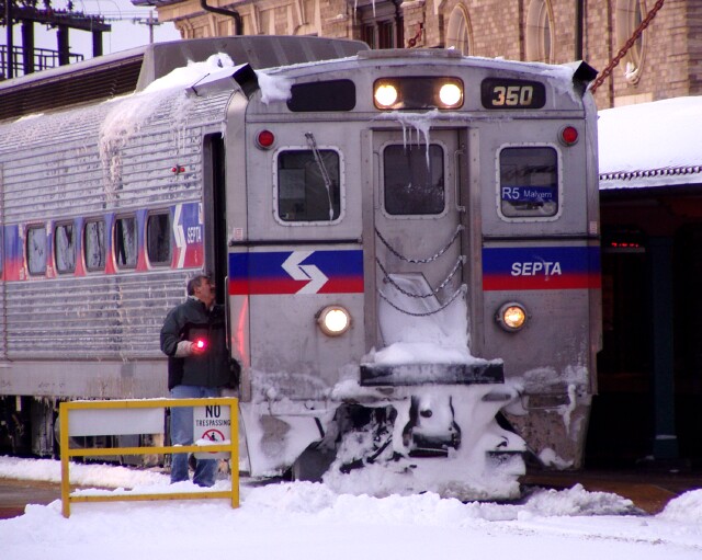| Seems that the snow has been packed into and around the horn, rendering it almost useless. At Lansdale Station, the engineer tries to resuscitate 350's muted horn with a flare. |