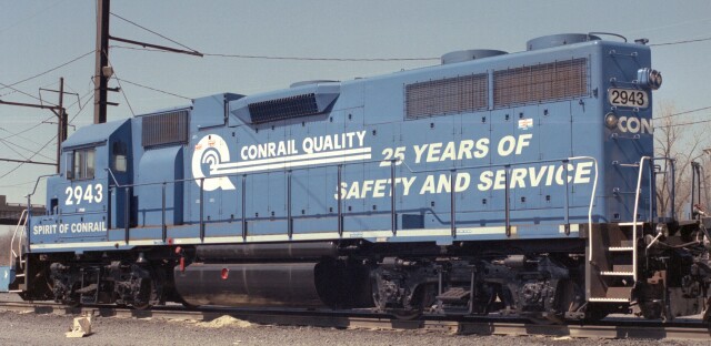 Today, April 1 2006, is Conrail's 30th birthday. Yes, Conrail still exists, albeit as a ghost of its former Northeast dominating self. It is an interesting twist of history that the bastard child of the railroad industry, a child that no one wanted or loved, would eventually not only get off the dole and pay back all the money it was lent, not only make money for people who invested in it when Conrail shed its "ward of the government status" and became a private corporation, but even find a warm, fuzzy place in the hearts of many an employee and railfan alike. Years after the Conrail empire was split between NS and CSX, glimmers of the pride that became Conrail still smoldered. A hot bed of this "rebellion" was CSAO's Pavonia Shops in Camden NJ, and out of this last remnant of Big Blue came CR/NS/PRR GP38 2943, the "Spirit of Conrail". The paint scheme was to honor Conrail's 25th birthday in 2001. Rumor has it that NS did not appreciate the gesture applied to one of "its" engines (NS and CSX supply all motive power to Conrail, which after the split had no engines of its own), nor the application of American Flags on the sides of the cabs of engines serviced there. The "Spirit", the former Conrail 7899 which was built for Penn Central as PC 7899 in February 1971, was involved in a minor accident not long after its debut, and was officially retired in 2003. Last report is that it is sitting in Altoona, waiting for everything to go dark when and if it gets rebuilt into an NS 5600 series GP38-3. But on this glorious day in April 2001, the "Spirit of Conrail" lives. |