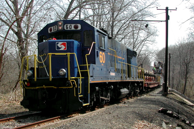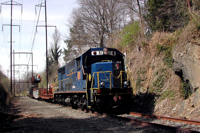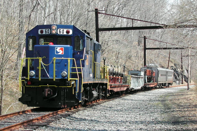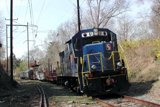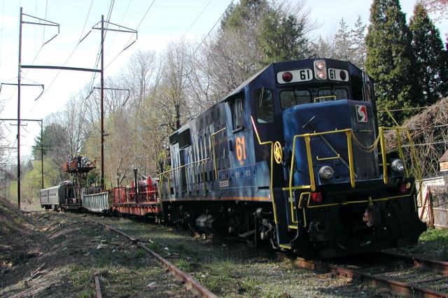 | SEPTA has discovered an interesting fact about its catenary: if you stop running juice through it, someone will steal it. The price of copper is at record highs and thieves will get it anywhere they can, and they have found a "gold mine" on the West Chester Branch. Since SEPTA does not operate passenger service west of Elwyn and the West Chester Railroad only runs between Glen Mills and West Chester, the trackage in between is rarely used and susceptible to pilferage. SEPTA sent the wire train out to work between Lenni and Glen Mills in late March in an effort to take down what had not already been stolen. RL1A 60 was the power this day. |