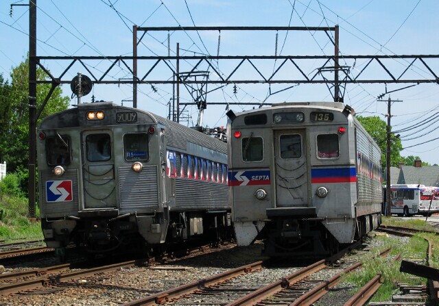 | One of the R5 Doylestown shuttles featured a Silverliner II pair, here led by Reading REB-13 9009 with former PRR 268 trailing as it passes Silverliner IV married pair 135-136, held in reserve as protect power at Glenside. |