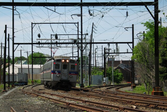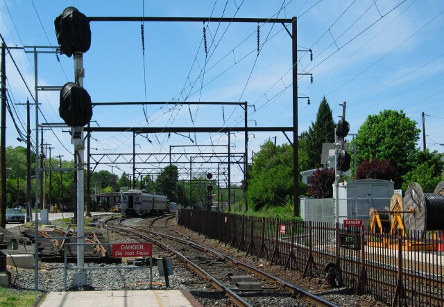 | A southbound R5 rolls under the new signal bridge for Carmel Interlocking, with a new signal mast for the R2 Warminster Line to the right (old=dark and rusty, new=shiny silver). |