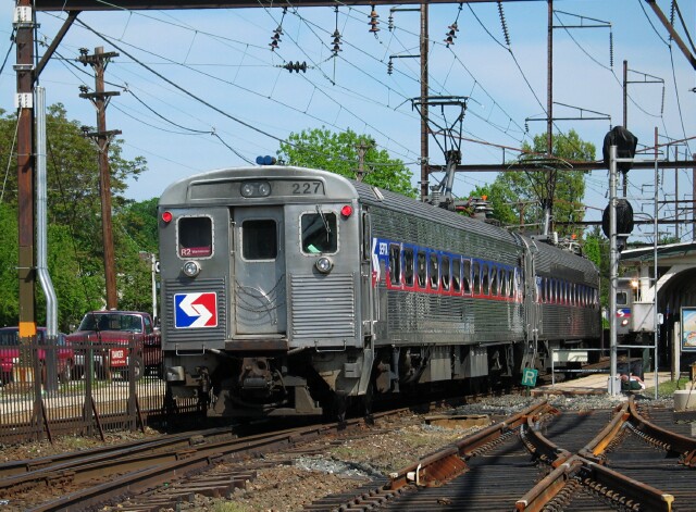 | Not to be outdone, one of the R2 Warminster trains had Silverliner III 227 leading REB-13 Silverliner II 9001, departing Glenside with an R5 Doylestown train right behind it. |