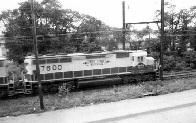 | SD45 7600 in the yellow and green "Bee Line Service" paint |