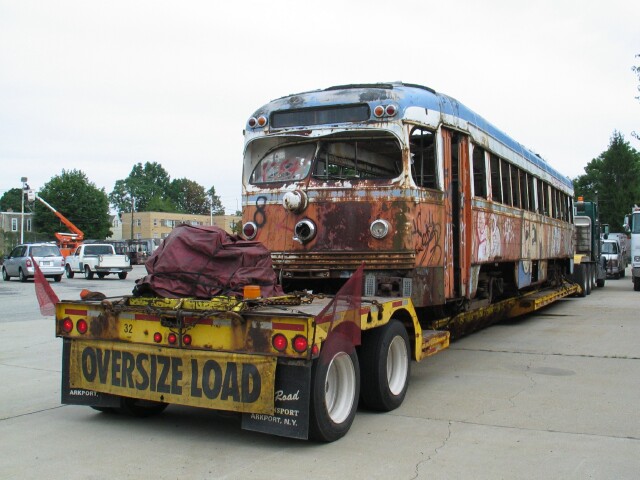| Former Red Arrow double ender 15 was among the former BVTA (later ECTMA) pieces stored at Germantown Depot. Looking all of its years and miles, it was loaded onto a low-boy to begin a journey to Brookville Equipment Corporation in Brookville PA and an uncertain future. |