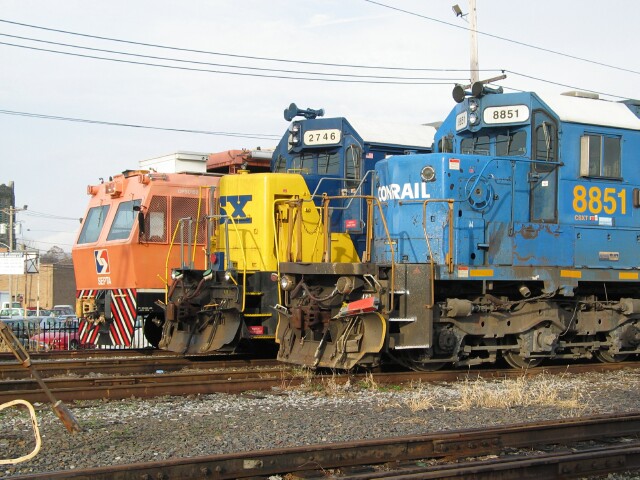 | While they were at it, the teams were also given a short briefing on the diesel units that were in the freight yard. Pictured before the drill were SEPTA catenary inspection car OPS0152, CSX GP38-2 2746 and CSX SD40-2 8851. |