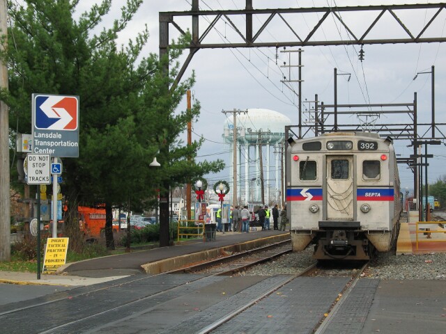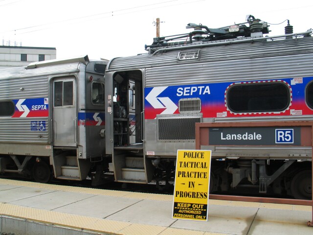 | Local law enforcement tactical response teams participated in drills on SEPTA equipment at Lansdale Station on November 16 2006. SEPTA provided a train that consisted of one of each of their current MU fleet: Silverliner IV married pair 392 and 393, Silverliner III 229 and Silverliner II 255. The train was parked on the runner at the station. They also staged a drill on a Route 96 bus that was laying over in Lansdale. |