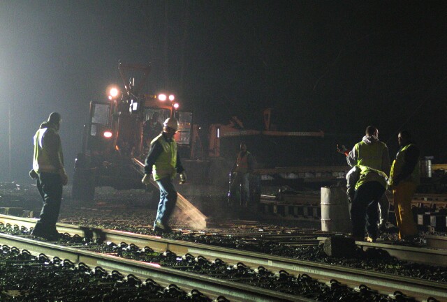 | With self-powered lights to illuminate the area, SEPTA was prepared to work round the clock in order to have the line up and running for Monday morning rush hour. |