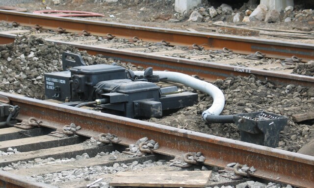 | The ballast tamper has finished its work for now while workers attend to some finishing touches. |