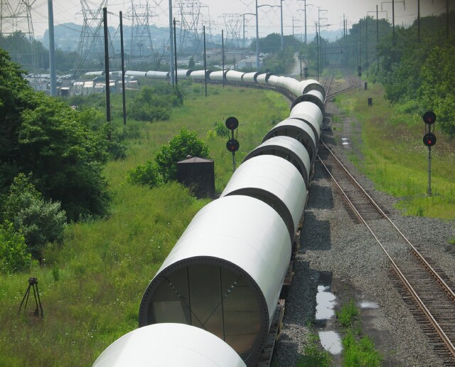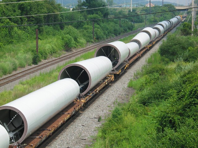 After the closure of most of U.S. Steel's operations at the Fairless Works near Morrisville PA, private and public interests sought to revitalize the huge complex as a hub for heavy industrial development. One of the companies to set up shop at the site is Gamesa Corporation, a Spanish windmill manufacturer, and this weekend a shipment of windmill tower parts from their Morrisville plant headed for the Midwest on NS dimensional train 053. Gamesa Wind US is headquartered in Philadelphia and the windmill parts (the towers, blades and nacelles) are manufactured in Morrisville, with Gamesa Wind US installing, operating and maintaining the units at the customer site. |