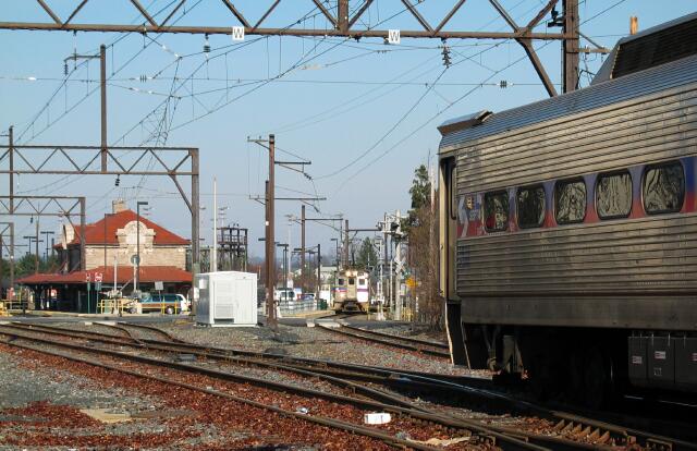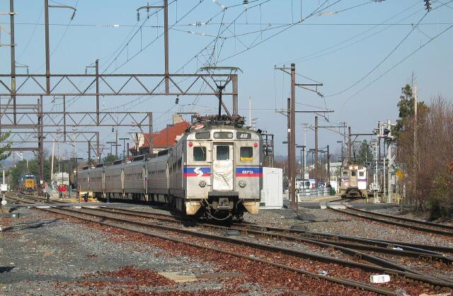 Train 6546 heading up to Doylestown developed power problems at Glenside, fouling Carmel Interlocking until Extra 419 coupled up to its hind end to give it a push to Doylestown, the net result being that 6546 arrived in Lansdale with seven Silverliner IV's. Here 6546 passes a maintainer at Broad Street in Lansdale. |