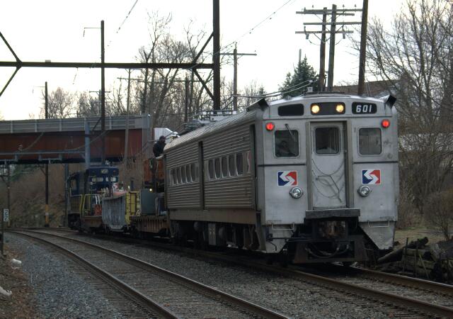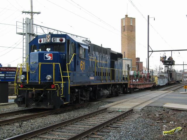 | The wire train has commenced work on the SEPTA Main Line, a project that will replace the overhead wires from Glenside to Lansdale and run into next year. For the first week, RL1A 61 has been doing the honors, stopping just short of Dale before heading south. |