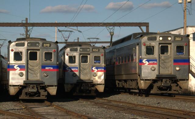 If you have been a railfan for any decent length of time, you have probably encountered the "oh no, not the same old thing" feeling, whether it is the ubiquitous NS Dash-9's or CSX's GEVO's or Amtrak's AEM-7's or SEPTA's Silverliner IV's. After a while, even digital photographers put their cameras down when they feel that this shot will be like the million others they have already taken. Railroad employees often ask "why are you taking the same pictures over and over again? Don't you have enough?" The answer to the second question is usually no, but here is the answer to the first, at least in this case. SEPTA striped their Silverliner fleet several years ago, applying red and blue decals along the window bands and cab ends. While the corrugated ends of the Silverliner II's and III's required a little ingenuity and adaptation (and variation), the Silverliner IV's monotonous slab ends were made for the decals. And with the Silverliner IV's being rebuilt and/or refurbished and the II's and III's earmarked for replacement by the Silverliner V's, it is clear that the IV's will be around for a bit, but for II's and III's, it is "get your shots now" time. Silverliner IV's were all the same and as common as pigeons, so why bother. Or so I thought. After taking umpteen thousand pictures of the IV's, I had previously noticed that some had cowcatchers and some had pilots, holdovers from their Reading Company and Penn Central days respectively. But not until now did I notice that the cab decals also varied. I guess some of us are just slow on the uptake. |