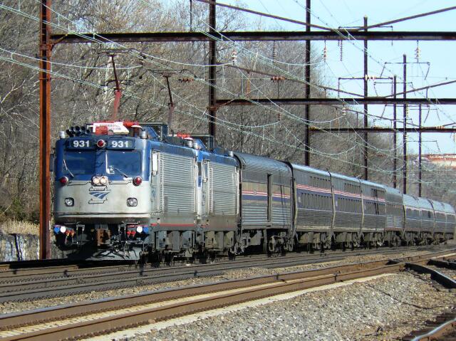 | A double for lunch? How about three late trains on the NEC? First of the double headers was Train 91 the southbound Silver Star with AEM-7 931 at the point, running 15 minutes late. |