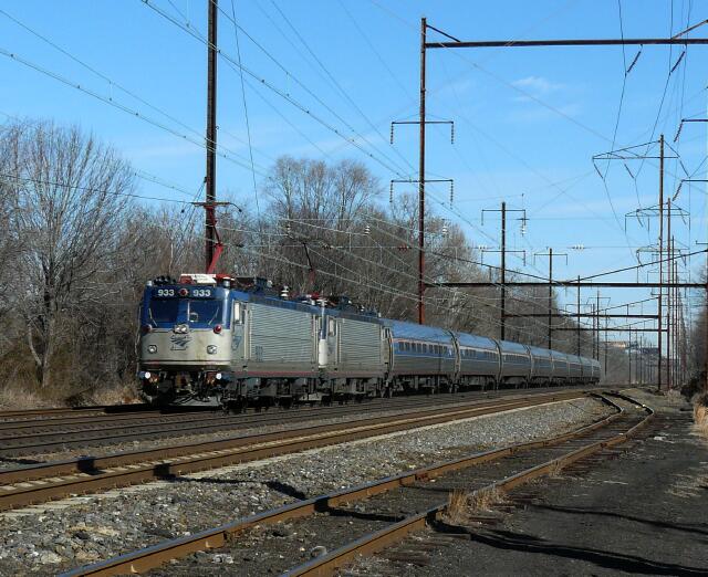 | Next was AEM-7 933 and sibling on Amtrak Regional 95 with the usual 8 Amfleet consist, running about 50 minutes late. |
