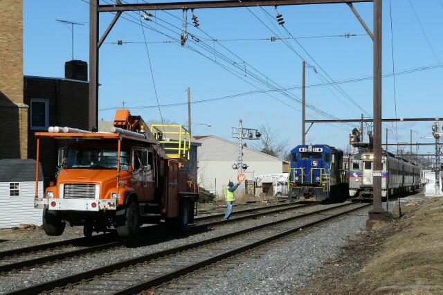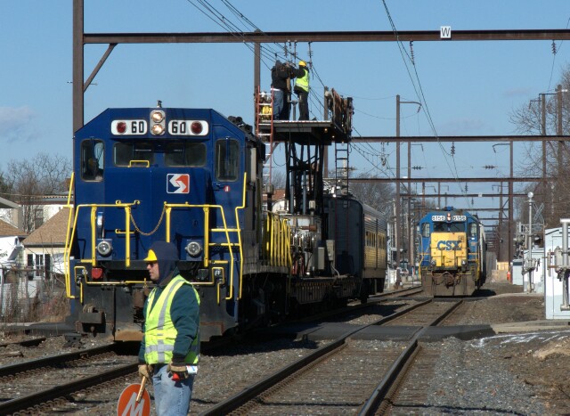 A number of circumstances caused a domino effect that resulted in a rare daylight run of CSX B738 from Lansdale to Warminster and back on January 30 2008. The morning before, a SEPTA local on the Warminster Line ran into some wire trouble between Hatboro and Willow Grove. A temporary repair was made that allowed service to resume, but a more permanent solution required the wire train, which was working the Main Line near North Wales, and would have tied up the single track line during evening rush hour. So Tuesday night the wire train made the repairs north of Willow Grove, completing them before the morning rush. This however prevented CSX B745 out of Lansdale to work the only CSX customer on the Warminster Branch, Conte Luna Foods, and as luck would have it, they would run out of flour early on January 30, halting production at the plant. So SEPTA and CSX coordinated to make a special run to bring a covered hopper down from Lansdale to join a loaded covered hopper already there, shift the plant and bring back four empties, all between SEPTA local runs on both the Warminster and Bethlehem Branches. With the skill that comes from years of experience, everything went like clockwork, with the train returning to Lansdale just after noon. A southbound MU from Doylestown passes the wire train and bucket truck stringing wire in North Wales. Single tracking on the Main Line between Dale and Gwynedd complicated the special move, which saw B738 leave Lansdale at 9:00 so it could get through the area before the wire train arrived to take Track 1 out of service. |
