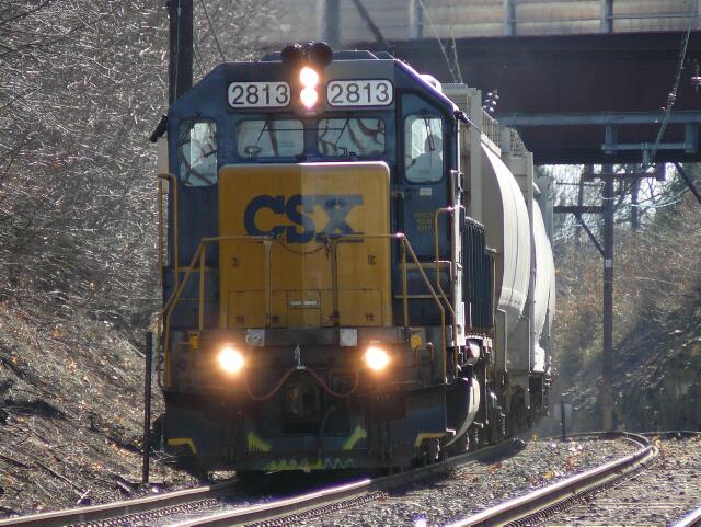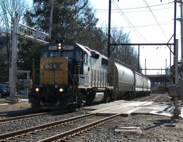 | Following the northbound MU, B738 with CSX GP38-2 2813 leading exits the Gwynedd Cut and approaches North Wales. The yellow paint on the outer edges of the plow denotes that the unit has a cutout plow and is equipped to operate in third rail territory, the yellow paint in the center was added just days before and its purpose is unknown. |