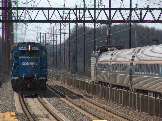 | Heading east on Track 1 as an Amtrak Regional passes on Track 3 is Conrail SAA FJ-10 led by NS GP38-2 5269, which was built by EMD back in 1973 as Penn Central 8058, later working for Conrail wearing the 8058 number and the same paint is still wears today. |