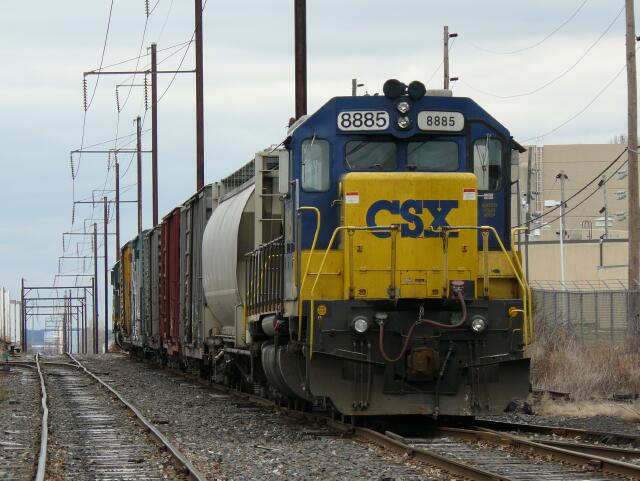 | When they depart in the evening, CSX 8885 and its mismatched number boards will lead. From information provided by Wayne Toy, CSXT 8885 is an SD40 (dead giveaways are short rear porch and rear nose brake wheel) rebuilt to SD40-2 specs. Built by EMD in 5/1967 for the Baltimore and Ohio, before becoming CSXT 8885, it was CR 6999 when rebuilt from CR 6290, and before that spent time as Central of New Jersey CNJ 3066 after it left the stable of the Baltimore and Ohio where it toiled as B&O 7487. |